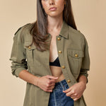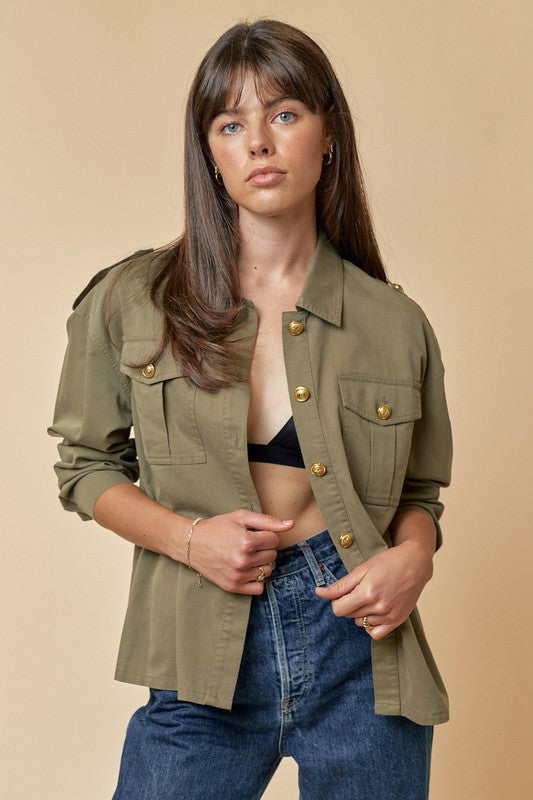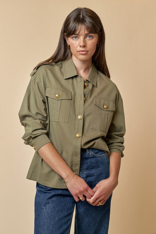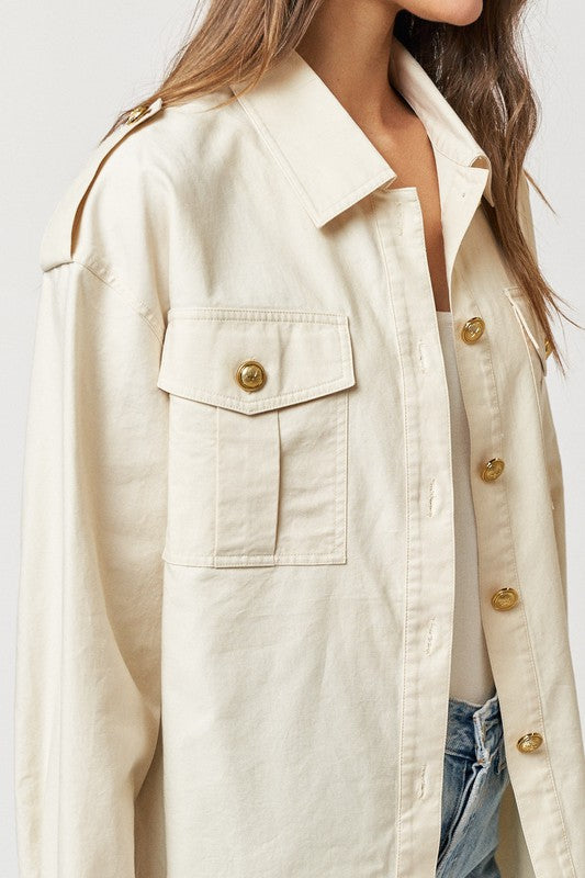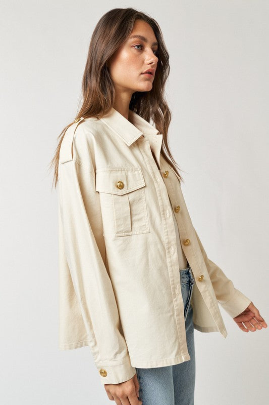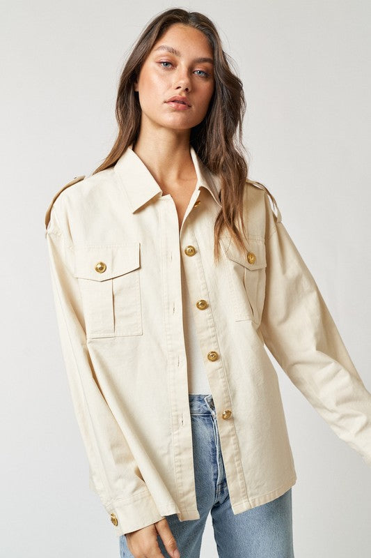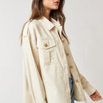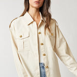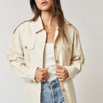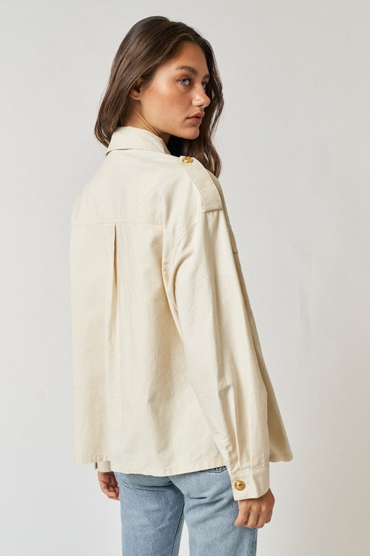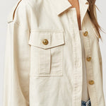 Experience the serene beauty of autumn in our Blackwood River Jacket. This cotton-blend jacket exudes a sense of tranquility with its button-up style and collared neckline. With thoughtful details like chest pocket accents, it's perfect for adding a touch of relaxed elegance to your fall wardrobe. Available in Cream and Olive.