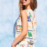 • Eye-catching postcard-style tropical print in citrus tones on an ivory base