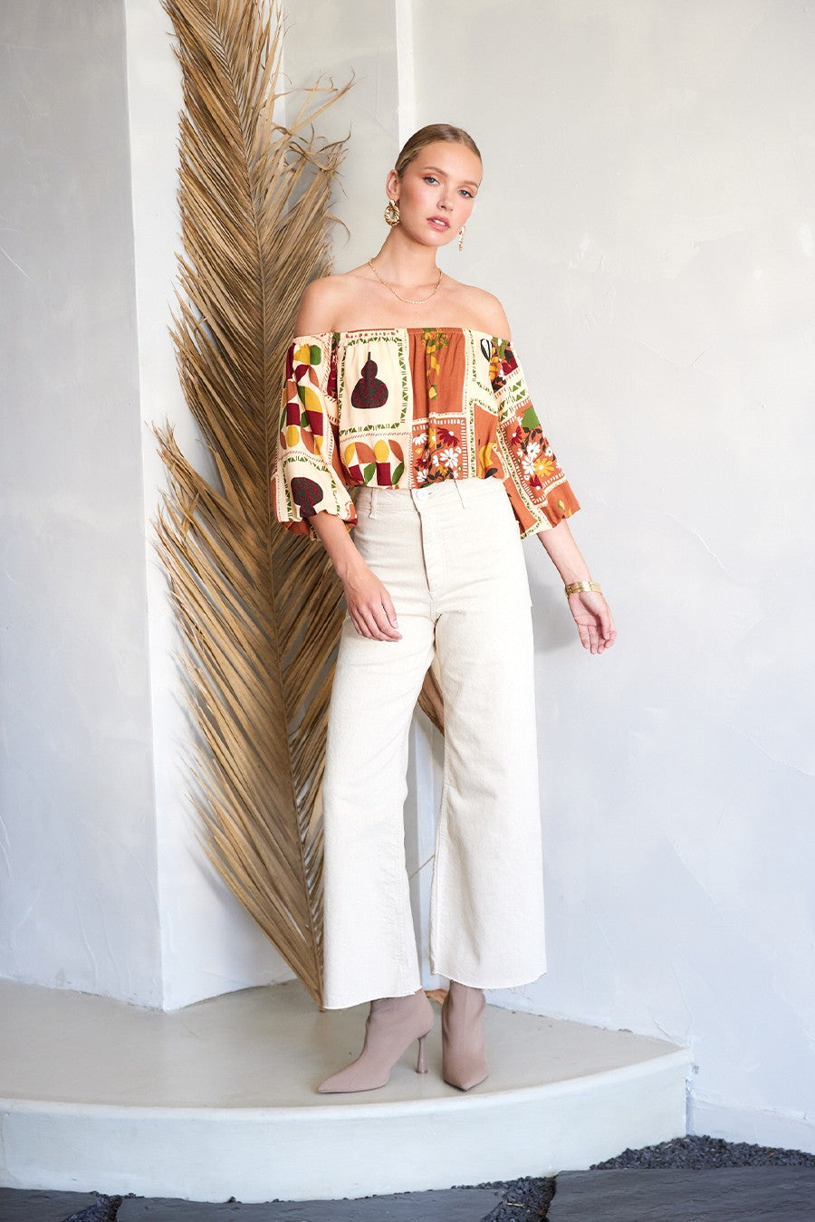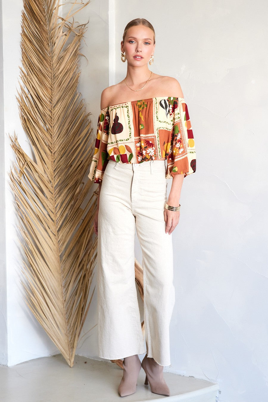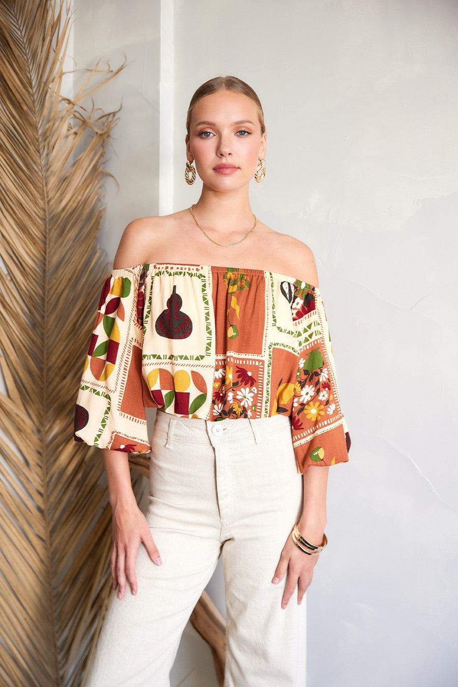 Feel light and carefree with the National Gallery Top. The off-shoulder neckline, 3/4 balloon sleeves, and cropped silhouette create the perfect mix of relaxed and stylish, ideal for warm days ahead.