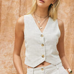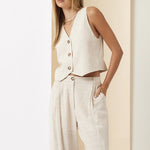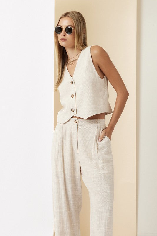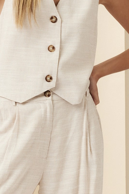 Find your perfect blend of comfort and style with the Parliament House Set. Pinstriped, wide-leg pants, and a relaxed V-neckline for an easy, polished look.