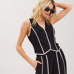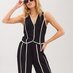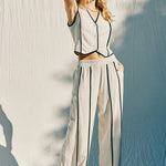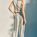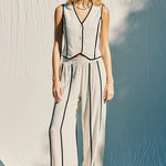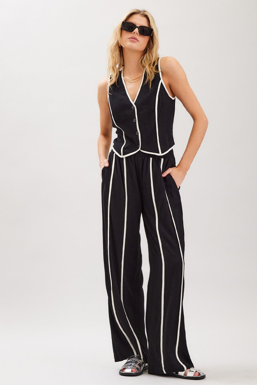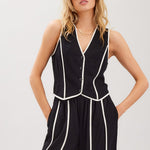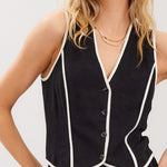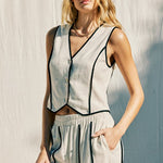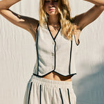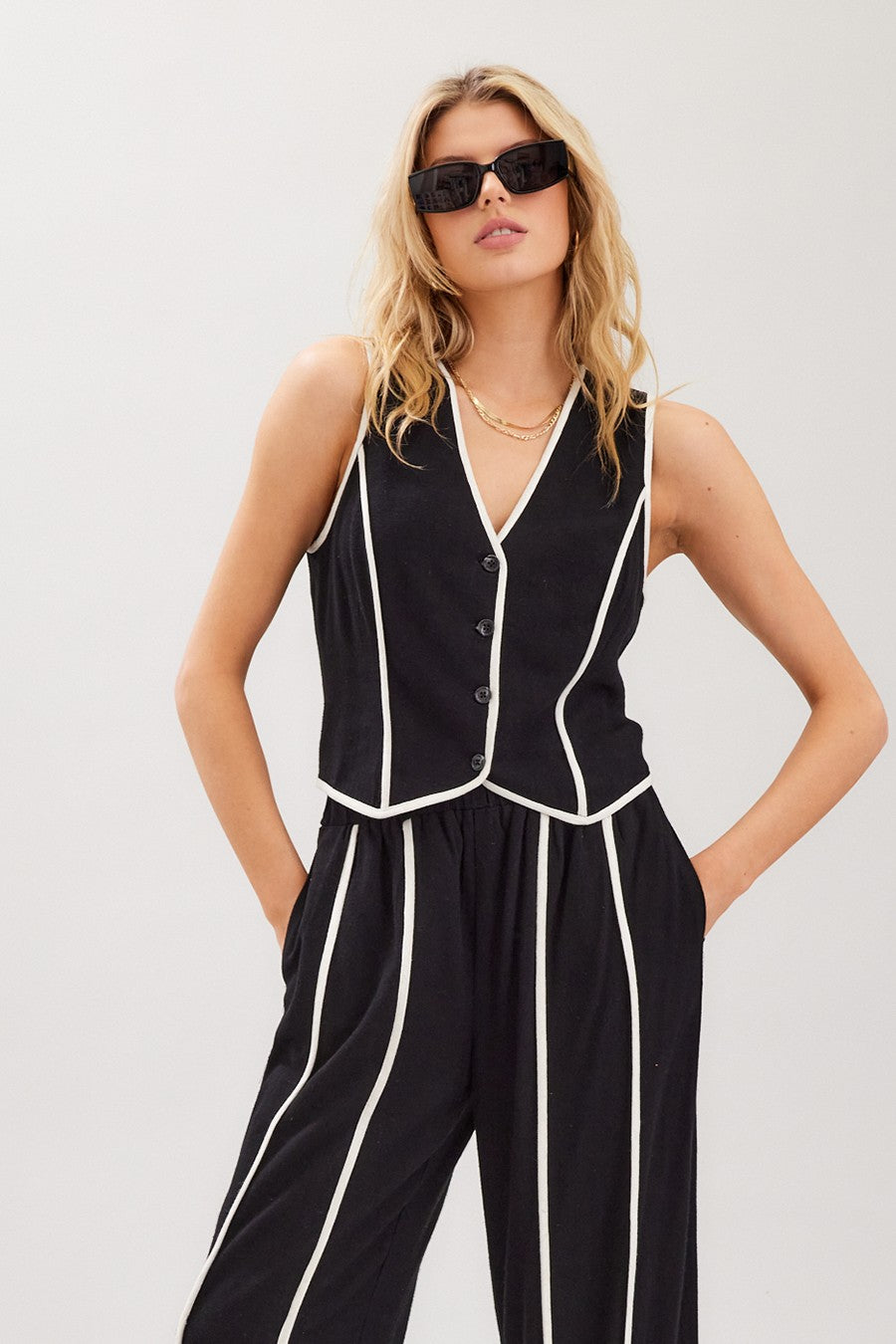 Experience ultimate comfort and style with our The Aquarium Vest, a must-have from our latest fall collection. Crafted from luxurious linen, it boasts intricate binding details and a coconut button front for added elegance. Its sleeveless design and pointed hem offer a relaxed fit, perfect for effortless layering on crisp autumn days.